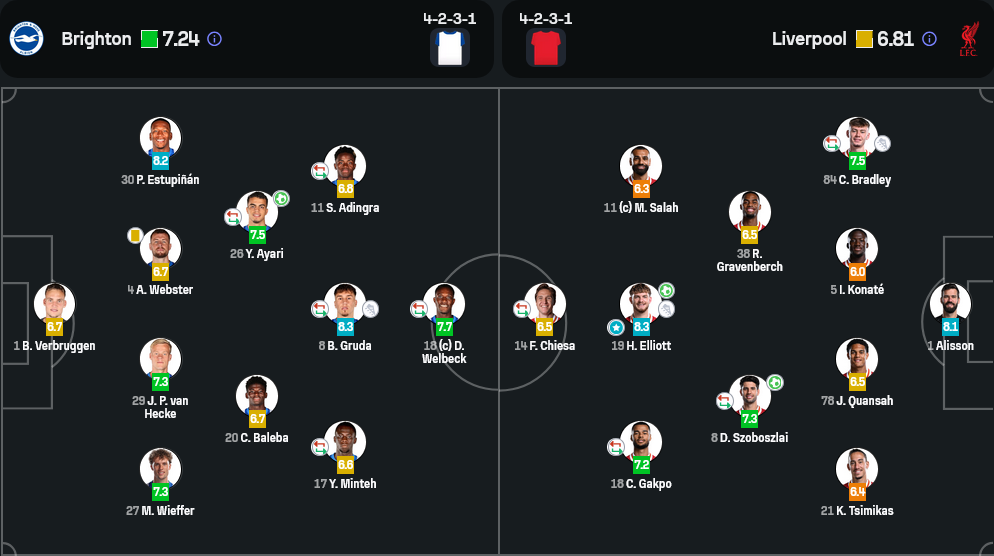 ฮาร์วีย์ เอลเลียตต์ – แม้ทีมจะแพ้ แต่ผลงานส่วนตัวของเขาโดดเด่นเกินใคร ทั้งยิง 2 ประตู สร้างสรรค์เกมรุกไม่หยุด และมีส่วนร่วมเกือบทุกจังหวะสำคัญ ได้เรตติ้งสูงถึง 8.3 เป็นตัวผลักดันเกมของลิเวอร์พูลได้อย่างยอดเยี่ยมตลอด 90 นาที