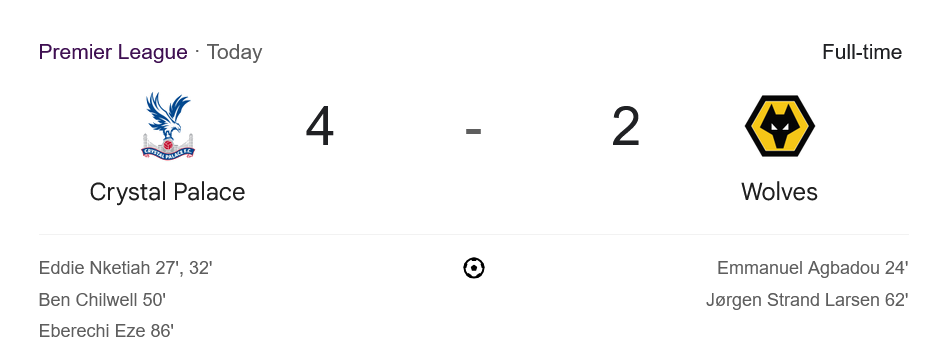 ครึ่งหลัง วูล์ฟส์พยายามครองเกม เดินบอลขึ้นช้าแต่แม่นยำ ทว่าโดนเกมรุกเร็วของเจ้าถิ่นโจมตีจนเสียประตูเพิ่มจากลูกยิงสุดคมของ เบน ชิลเวลล์ นาที 50 แม้ ลาร์เซ่น จะยิงให้วูล์ฟส์ไล่มาเป็น 3-2 นาที 62 แต่สุดท้ายก็โดนทีเด็ดของ เอเบเรชี เอเซ่ ปิดบัญชีนาที 86 พาเลซเก็บชัยสุดดุ 4-2 ได้สำเร็จ