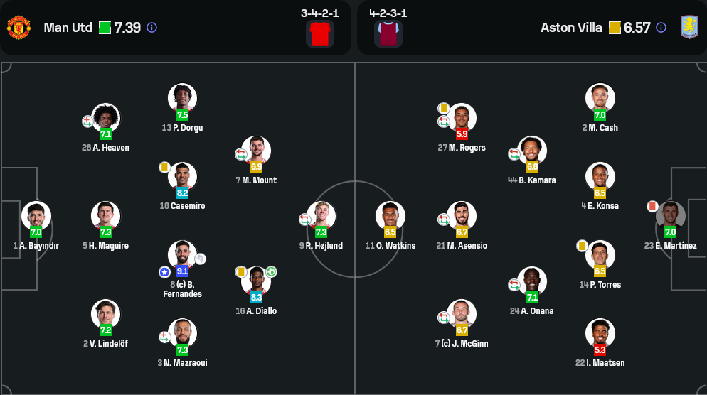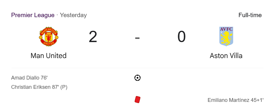 ครึ่งหลัง รูเบน อาโมริม ปรับจังหวะเกมรุกให้ทีมเดินหน้าเร็วขึ้น และในนาที 76 แมนฯ ยูไนเต็ดก็ปลดล็อกได้สำเร็จจากจังหวะจ่ายทะลุช่องของ บรูโน่ แฟร์นันด์ส ก่อนที่ อาหมัด ดิยัลโล จะหลุดเข้าไปยิงผ่านมือผู้รักษาประตูสำรองของวิลล่าเป็นประตูนำ 1-0 จากนั้นนาที 87 ปิศาจแดงมาได้จุดโทษจากจังหวะทำแฮนด์บอล และเป็น คริสเตียน อีริคเซ่น ที่รับหน้าที่สังหารไม่พลาด จบเกม แมนฯ ยูไนเต็ด ชนะ 2-0 อย่างสะใจแฟนบอล