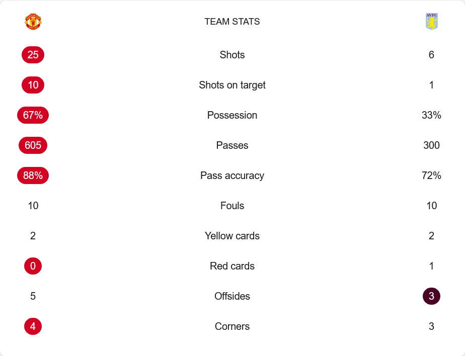 แมนฯ ยูไนเต็ด ครองบอลมากถึง 67% เทียบกับวิลล่าที่มีเพียง 33% โดยทีมเจ้าบ้านยิงทั้งหมด 25 ครั้ง เข้ากรอบถึง 10 ครั้ง ขณะที่ทีมเยือนยิงเพียง 6 ครั้งและเข้ากรอบแค่หนเดียว แมนฯ ยูไนเต็ดผ่านบอล 605 ครั้งด้วยความแม่นยำ 88% ส่วนวิลล่าผ่านบอลเพียง 300 ครั้งและความแม่นยำอยู่ที่ 72% ทั้งสองทีมทำฟาวล์เท่ากันที่ 10 ครั้ง แต่ทีมเยือนได้ใบเหลือง 2 ใบและใบแดง 1 ใบ ส่วนเจ้าบ้านได้ใบเหลือง 2 ใบเท่านั้น ยูไนเต็ดล้ำหน้ามากถึง 5 ครั้ง เทียบกับ 3 ครั้งของวิลล่า และได้เตะมุมมากกว่านิดหน่อยที่ 4 ต่อ 3
