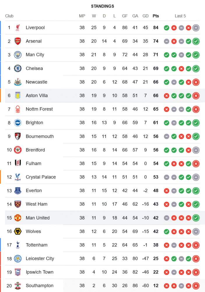 ชัยชนะในเกมนี้ทำให้ แมนเชสเตอร์ ยูไนเต็ด จบฤดูกาลด้วย 42 คะแนน อยู่ในอันดับ 15 ของตาราง บ้านผลบอล ถือว่าปีนี้เป็นซีซั่นที่ต้องจดจำในฐานะการเปลี่ยนผ่านและเตรียมสร้างใหม่ภายใต้การคุมทีมของ รูเบน อาโมริม ด้าน แอสตัน วิลล่า ที่แม้จะแพ้ แต่ยังคงจบอันดับ 6 ด้วยคะแนน 66 แต้ม ผ่านเข้าไปเล่นบอลยุโรปในซีซั่นหน้าได้สำเร็จ
