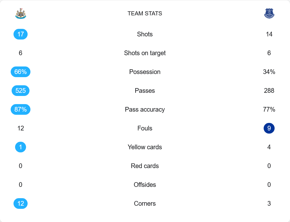 แม้นิวคาสเซิ่ลจะเป็นฝ่ายครองเกมเหนือกว่าแต่จบด้วยความพ่ายแพ้ โดยเจ้าบ้านมีเปอร์เซ็นต์การครองบอลสูงถึง 66% ยิงทั้งหมด 17 ครั้ง เข้ากรอบ 6 ครั้ง และได้ลูกเตะมุมถึง 12 ครั้ง ส่วนเอฟเวอร์ตันมีโอกาสยิง 14 ครั้ง เข้ากรอบ 6 ครั้งเช่นกัน ครองบอลเพียง 34% และจ่ายบอล 288 ครั้ง เทียบกับ 525 ครั้งของเจ้าบ้าน แต่จบเกมเป็นฝ่ายที่คมกว่า ทีมเยือนทำฟาวล์น้อยกว่า (9 ต่อ 12) และแม้จะได้ใบเหลืองถึง 4 ใบ ก็สามารถควบคุมสถานการณ์ได้อย่างมีวินัยจนจบเกม