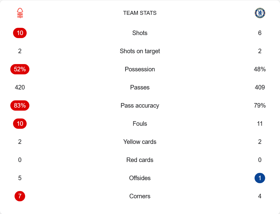 แม้จะเป็นเกมที่ไม่หวือหวา แต่สถิติบ่งชี้ว่าทั้งสองทีมสู้กันสูสี โดยฟอเรสต์ครองบอลมากกว่าเล็กน้อยที่ 52% และมีจำนวนจ่ายบอล 420 ครั้ง ส่วนเชลซีมีอัตราครองบอล 48% กับการผ่านบอล 409 ครั้ง ความแม่นยำในการจ่ายบอลของเจ้าบ้านอยู่ที่ 83% ขณะที่ทีมเยือนอยู่ที่ 79% การยิงประตูของฟอเรสต์เกิดขึ้น 10 ครั้ง เข้ากรอบ 2 ส่วนเชลซีมีโอกาสยิงเพียง 6 ครั้ง แต่เข้ากรอบ 2 ครั้ง และหนึ่งในนั้นคือประตูชัย ทั้งสองทีมมีจำนวนฟาวล์ใกล้เคียงกัน และได้ใบเหลืองฝั่งละ 2 ใบ ฟอเรสต์ล้ำหน้าถึง 5 ครั้ง ส่วนเชลซีโดนแค่ 1 และลูกเตะมุมเป็นของฟอเรสต์มากถึง 7 ครั้ง เทียบกับเชลซีที่ได้ 4 ครั้ง