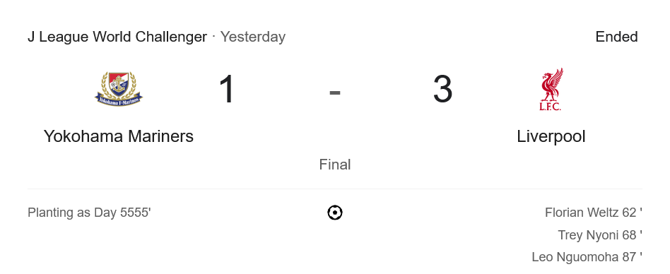 หงส์เปิดเครื่องรัวสามเม็ด ซิวชัยสุดแกร่ง เข้าสู่ครึ่งหลัง ลิเวอร์พูลขยับหมากเปลี่ยนตัวสำรองหลายราย โดยเฉพาะการส่ง ดาร์วิน นูนเญซ, เคอร์ติส โจนส์ และ เทรย์ นโยนี ลงมาเปลี่ยนจังหวะเกม และได้ผลทันตา ในนาที 62 ฟลอเรียน เวิร์ตซ์ กดตีเสมอให้ทีมเยือน จากนั้นนาที 68 นโยนี แข้งวัยรุ่นก็ใส่สกอร์นำ 2-1 ก่อนที่อีกหนึ่งแข้งดาวรุ่งอย่าง ลีโอ อึนกูโอโมฮา จะตอกฝาโลงในนาที 87 ด้วยลูกยิงจ่อๆ ในเขตโทษ ช่วยให้ ลิเวอร์พูลเก็บชัยแบบสุดเดือด 3-1 และเรียกเสียงปรบมือจากแฟนบอลแดนปลาดิบได้กระหึ่มสนาม