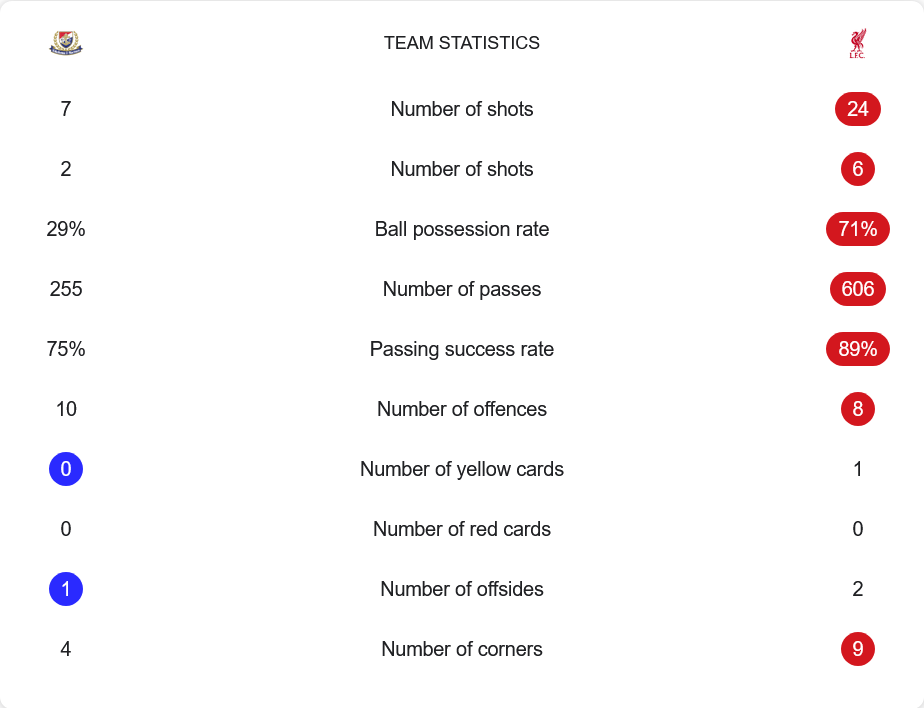 แม้เป็นเกมเยือน แต่ลิเวอร์พูลครองเกมได้เบ็ดเสร็จด้วยการครองบอลถึง 71% ผ่านบอลสำเร็จมากกว่า 600 ครั้ง และสร้างโอกาสยิงได้ถึง 24 ครั้ง (มากกว่าโยโกฮาม่าที่ทำได้เพียง 7 ครั้ง) รวมถึงการได้ลูกเตะมุมถึง 9 ครั้ง เทียบกับเจ้าบ้านที่ได้แค่ 4 ครั้ง นอกจากนี้ยังมีเปอร์เซ็นต์ผ่านบอลสำเร็จสูงถึง 89% เทียบกับโยโกฮาม่าที่อยู่แค่ 75% เท่านั้น ตัวเลขเหล่านี้สะท้อนความเหนือชั้นด้านเกมรุกและการครองบอลของ “หงส์แดง” ได้อย่างชัดเจน