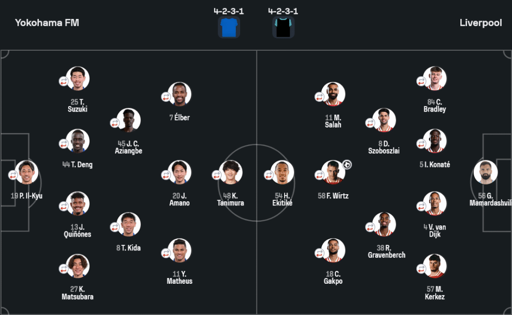 โยโกฮาม่าปลดล็อกก่อน ลิเวอร์พูลครองบอลแต่ไร้สกอร์ แม้จะตกเป็นรองเรื่องการครองบอลตั้งแต่ต้นเกม แต่ โยโกฮาม่า เอฟ มารินอส กลับเป็นฝ่ายเบิกสกอร์แรกในนาที 54 จากจังหวะที่ อาซาฮิ อูเอนากะ ซัดแบบไม่ต้องจับ ส่งบอลเสียบเสาอย่างเฉียบขาดให้ทีมเจ้าบ้านขึ้นนำ 1-0 ท่ามกลางความตกตะลึงของแนวรับลิเวอร์พูลที่เสียประตูแบบไม่จำเป็น ขณะที่ฝั่ง “หงส์แดง” แม้จะครองบอลถึง 71% และมีโอกาสยิงถึง 12 ครั้งในครึ่งแรก แต่ยังไม่สามารถเจาะแนวรับโยโกฮาม่าได้ ส่งผลให้จบ 45 นาทีแรกเป็นฝ่ายตามหลัง