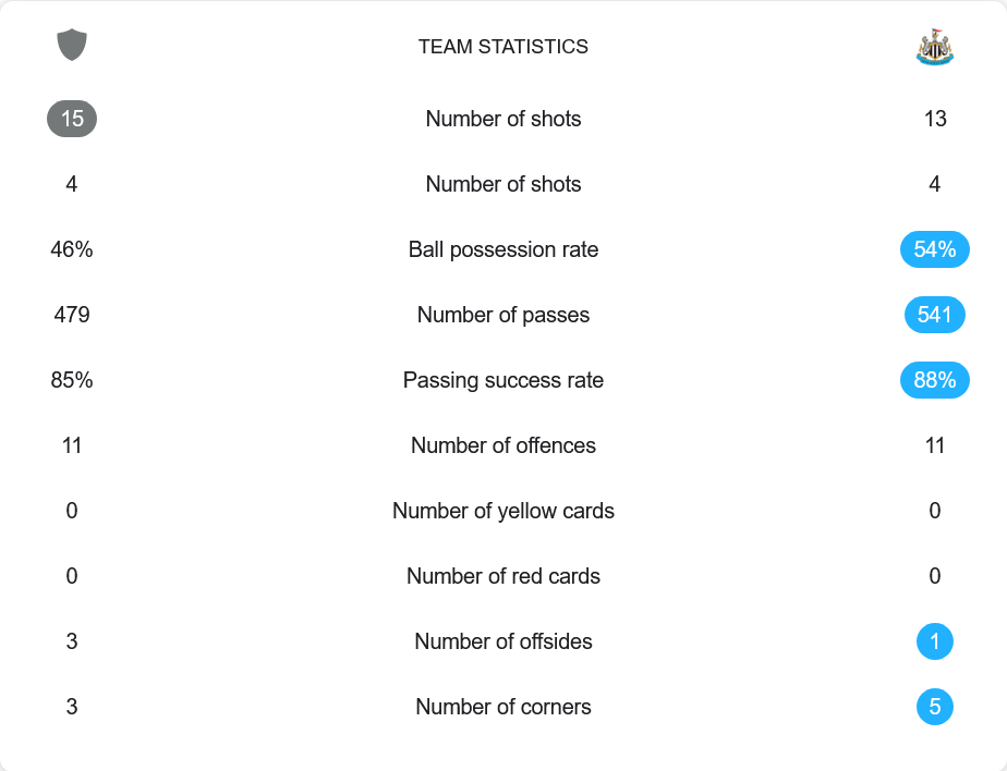 แม้นิวคาสเซิ่ลจะมีเปอร์เซ็นต์การครองบอลมากกว่าที่ 54% และผ่านบอลมากถึง 541 ครั้งด้วยความแม่นยำสูงถึง 88% แต่พวกเขากลับยิงเข้ากรอบเพียง 4 ครั้งจากโอกาสทั้งหมด 13 หน ขณะที่ K-League Allstars ครองบอลเพียง 46% แต่มีโอกาสยิงถึง 15 ครั้ง เทียบเท่าและเฉียบคมกว่าในพื้นที่สุดท้าย นอกจากนี้ นิวคาสเซิ่ลยังได้ลูกเตะมุมมากกว่า 5 ต่อ 3 แต่กลับไม่สามารถใช้โอกาสเหล่านั้นเปลี่ยนเป็นประตูได้แม้แต่ลูกเดียว