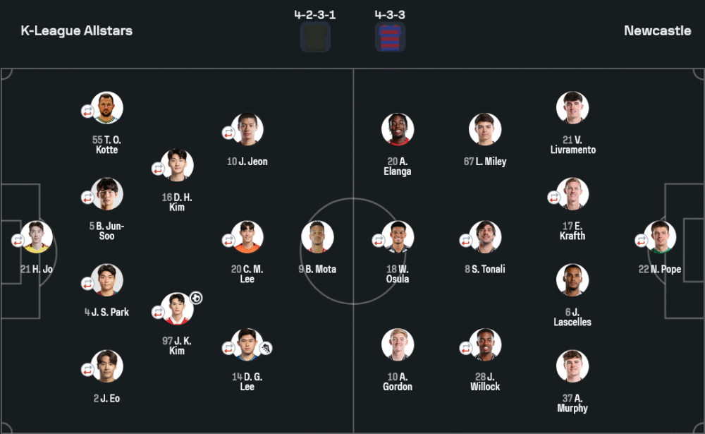 เริ่มครึ่งหลัง เอ็ดดี้ ฮาว ขยับส่งผู้เล่นสำรองลงสนามเป็นระลอก ตั้งแต่นาทีที่ 46 ไล่ไปจนถึง 90 แต่แม้จะเปลี่ยนแปลงมากแค่ไหน รูปเกมก็ยังเป็นลูปเดิม คือครองบอลได้บ้าง แต่เจาะแนวรับไม่ได้ จังหวะเข้าทำขาดความเฉียบคม โดยเฉพาะในพื้นที่สุดท้ายที่แทบไม่มีจังหวะยิงจะแจ้ง ขณะที่ K-League Allstars เน้นรับแน่นและสวนกลับเร็ว มีโอกาสบ้างแต่ก็ไม่สามารถยิงเพิ่มได้ จบเกมด้วยชัยชนะของเจ้าบ้านแบบเฉือนหวิว 1-0 พร้อมส่งนิวคาสเซิ่ลกลับบ้านด้วยสถิติแพ้ 3 เกมรวดในทัวร์อุ่นเครื่องเอเชีย