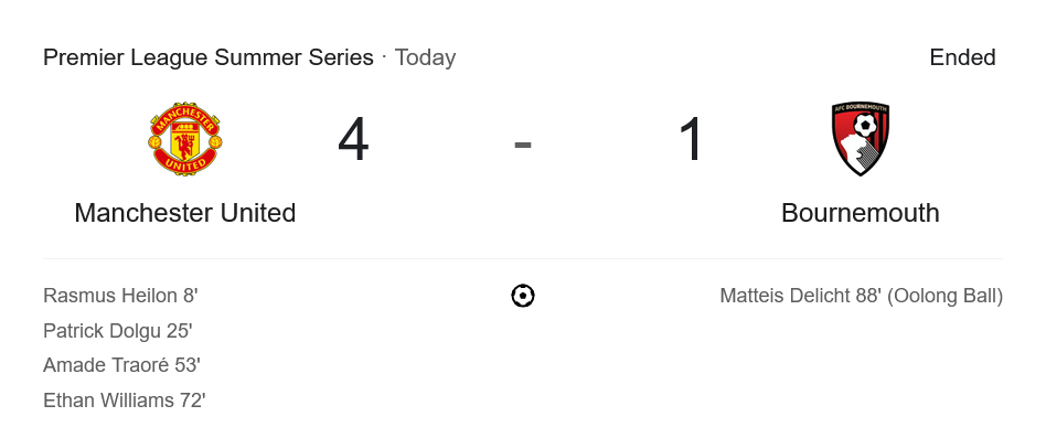 จาก : ผลบอลสด พรีเมียร์ลีกซัมเมอร์ซีรีส์ ระหว่าง แมนเชสเตอร์ ยูไนเต็ด 4-1 บอร์นมัธ เอเอฟซี วันนี้ 31/7/68 – บ้านกีฬา
