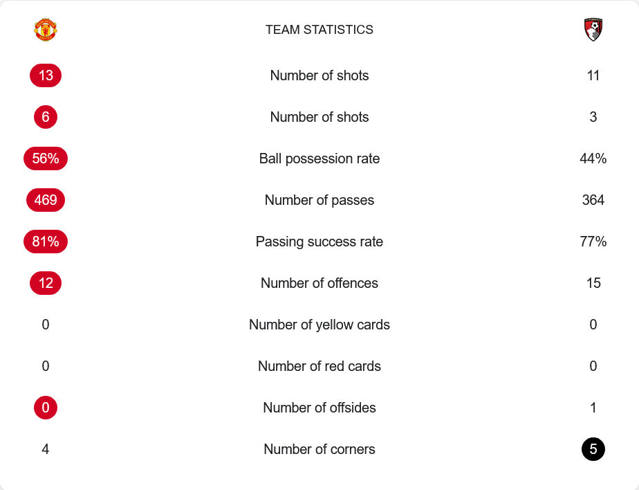แมนเชสเตอร์ ยูไนเต็ดครองบอล 56% โดยมีจำนวนผ่านบอลถึง 469 ครั้ง และอัตราความแม่นยำ 81% พวกเขามีโอกาสยิงทั้งหมด 13 ครั้ง เข้ากรอบ 6 ครั้ง และได้เตะมุม 4 ครั้ง ด้านบอร์นมัธ แม้ครองบอลน้อยกว่า (44%) และมีโอกาสยิงเพียง 11 ครั้ง เข้ากรอบแค่ 3 หน แต่เกมนี้ชัดเจนว่าพวกเขาขาดประสิทธิภาพในพื้นที่สุดท้าย เกมนี้ไม่มีใบเหลืองหรือใบแดงจากทั้งสองฝ่าย แต่บอร์นมัธโดนจับล้ำหน้า 1 ครั้ง และเสียฟาวล์มากกว่ายูไนเต็ด (15 ต่อ 12)