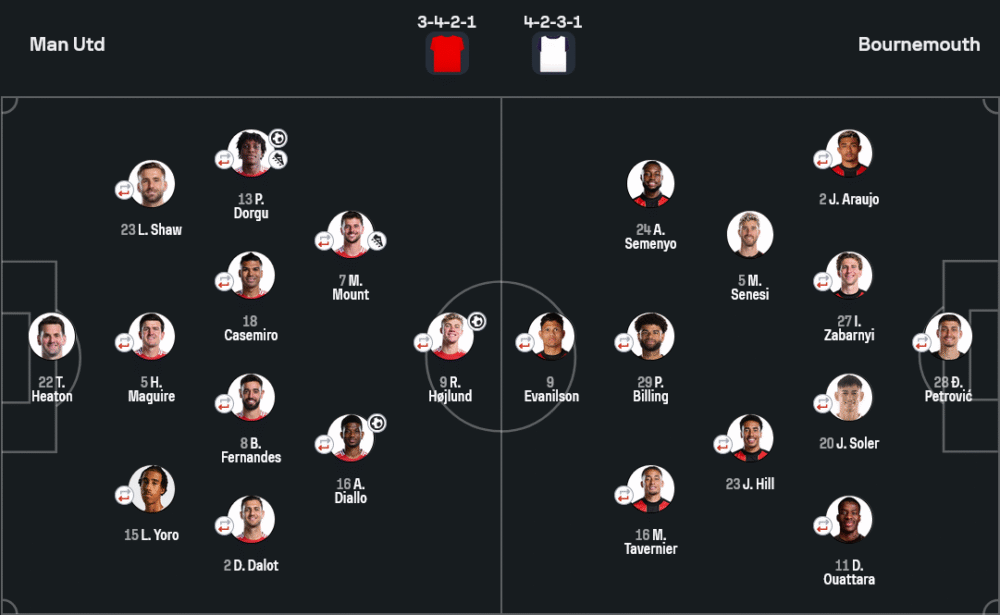 เกมนี้ แมนยู ใช้แผน 3-4-2-1 ที่เน้นการขึ้นเกมจากแดนกลางผ่านคาเซมิโร่และเมาท์ ผสานกับสองวิงที่ดันสูงและมีบทบาททั้งรุกและรับอย่างเต็มที่ การกดดันแดนบนทำให้แนวรับของบอร์นมัธเสียสมาธิอยู่บ่อยครั้ง ขณะที่ บอร์นมัธ ใช้ระบบ 4-2-3-1 เน้นแพ็คแดนกลางหนาแน่น แต่กลับโดนเจาะซ้ำจากลูกทะลุช่องและความผิดพลาดส่วนตัว โดยเฉพาะเซนเตอร์แบ็คที่รับมือความเร็วของแนวรุกปีศาจแดงไม่ได้เลย การวิเคราะห์บอลในแมตช์นี้ชี้ชัดว่าแผนการเล่นของยูไนเต็ดมีมิติมากกว่า และสมดุลระหว่างเกมรุกกับรับนั้นเหนือกว่าบอร์นมัธอย่างเห็นได้ชัด