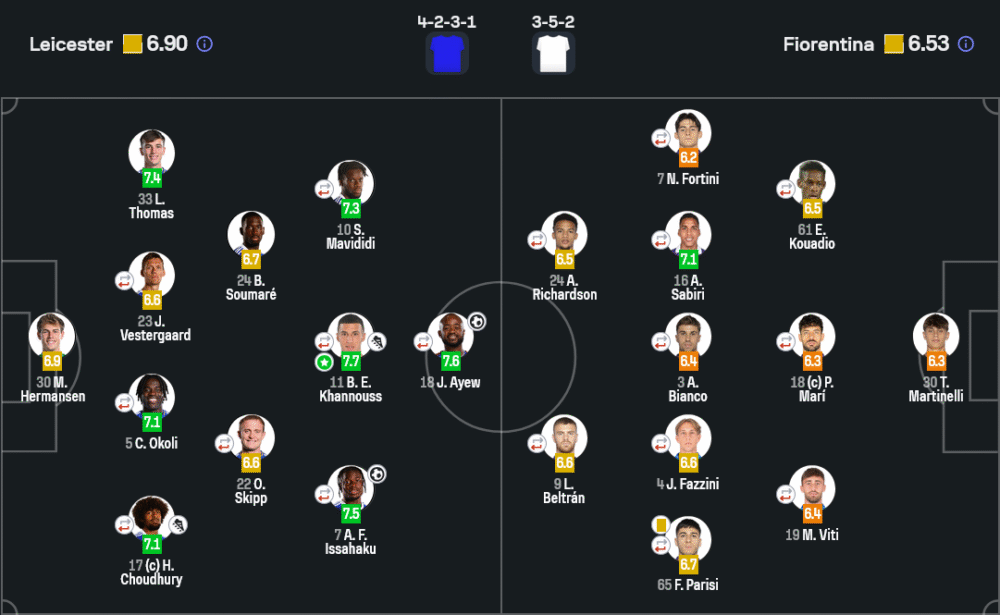ครึ่งหลัง ฟิออเรนติน่าพยายามปรับเกมด้วยการเปลี่ยนผู้เล่นชุดใหญ่ถึง 11 คนในช่วงนาทีที่ 63 หวังกลับมาเอาคืน แต่เกมยังอยู่ภายใต้การควบคุมของลูกทีมมาร์ติ ซิฟวนเตส ที่แพ็คเกมรับได้ดี ขณะที่ฝั่งเลสเตอร์เองก็ใช้โอกาสเปลี่ยนแข้งดาวรุ่งลงสนามทดลองระบบไปพร้อมกัน แม้สกอร์จะไม่เพิ่ม แต่ภาพรวมยังเหนือกว่าชัดเจน จบเกมด้วยชัยชนะ 2-0 พร้อมเสียงปรบมือกึกก้องจากแฟนบอล