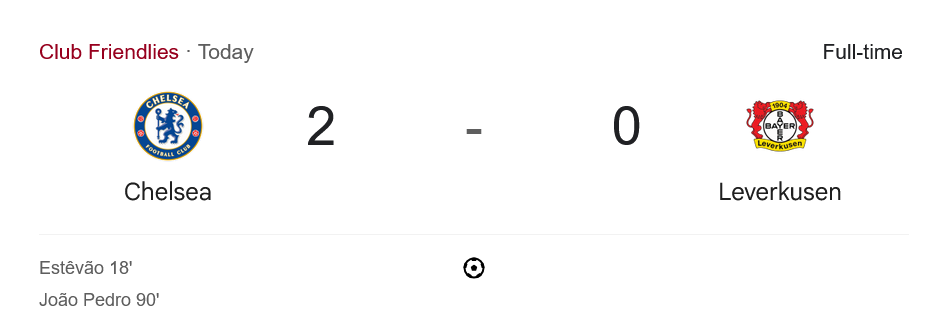 เลเวอร์คูเซินพยายามขยับเกมรุกมากขึ้นหลังส่ง คีแรน โฟฟาน และ วิคเตอร์ โบนิแฟซ ลงมา แต่ก็ยังเจอแนวรับเชลซีที่คุมพื้นที่แน่นหนา ขณะที่เจ้าบ้านยังคงครองบอลเหนียวแน่นและรอจังหวะสวนกลับ นาที 90 เกมถูกปิดฉากด้วยการยิงของ ชูเอา เปโดร ตัวสำรองที่ลงมาสร้างความแตกต่าง ยิงผ่านมือ มาร์ค เฟล็คเค่น ที่แม้วันนี้จะโชว์เซฟหลายครั้งจนได้คะแนนสูงสุด แต่ก็หยุดสกอร์ไม่อยู่ จบเกมเชลซีชนะ 2-0 อย่างเหนือชั้น