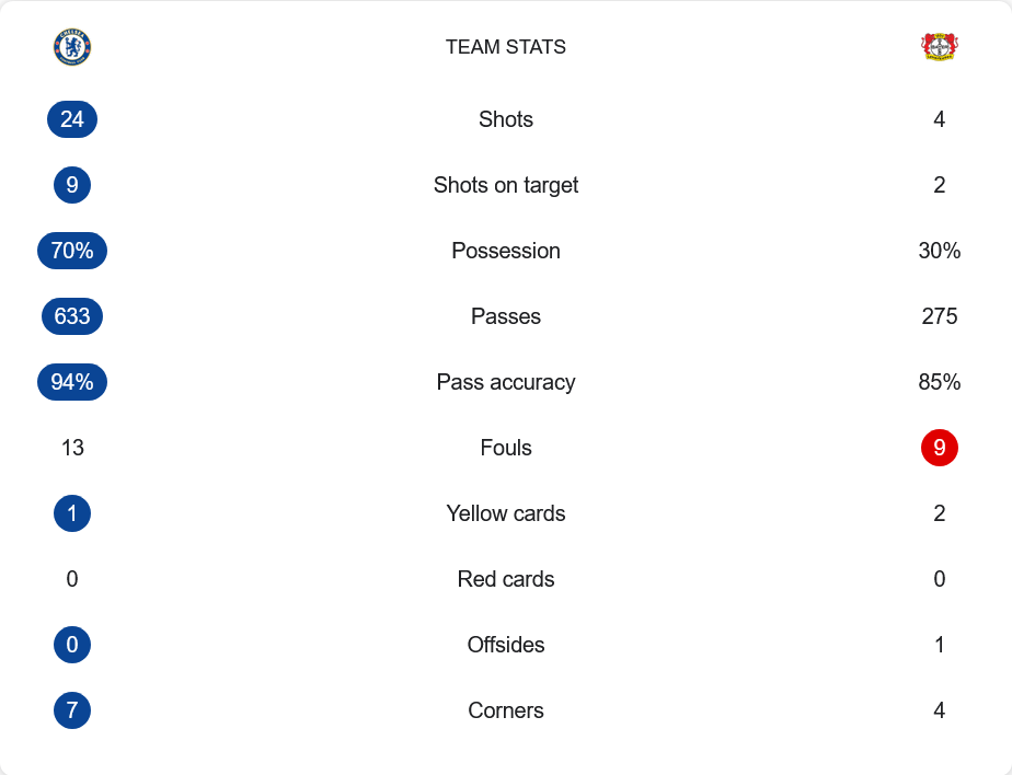 เชลซีครองบอลสูงถึง 70% ต่อ 30% ของเลเวอร์คูเซิน จ่ายบอลแม่นยำ 94% จาก 633 ครั้ง ขณะที่ทีมเยือนจ่ายแม่น 85% จาก 275 ครั้ง เจ้าถิ่นสร้างโอกาสยิงถึง 24 ครั้ง เข้ากรอบ 9 ขณะที่เลเวอร์คูเซินมีเพียง 4 ครั้ง และตรงกรอบ 2 ครั้ง จำนวนฟาวล์ค่อนข้างใกล้กัน 13 ต่อ 9 ใบเหลืองเจ้าบ้าน 1 ใบ ทีมเยือน 2 ใบ เตะมุมเชลซี 7 ครั้ง เลเวอร์คูเซิน 4 ครั้ง