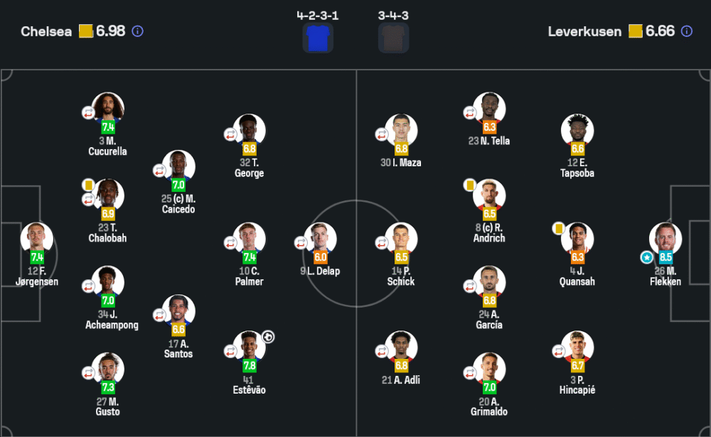 เชลซีของมาเรสก้าโชว์ระบบ 4-2-3-1 ที่ยืดหยุ่นและไหลลื่นในเกมรุก โดยใช้ พาล์มเมอร์ เป็นจอมทัพเชื่อมระหว่างกลางกับหน้า ขณะที่ปีกสองฝั่งอย่าง เอสเตวาว และ จอร์จ สลับตำแหน่งสร้างความสับสนให้แนวรับคู่แข่ง การรับใช้การเพรสซิ่งสูง บีบให้เลเวอร์คูเซินต่อบอลพลาดหลายครั้ง เกมริมเส้นฝั่งขวาที่มี กุสโต้ ขึ้นซ้อนทำให้ทีมได้เปรียบชัดเจน
