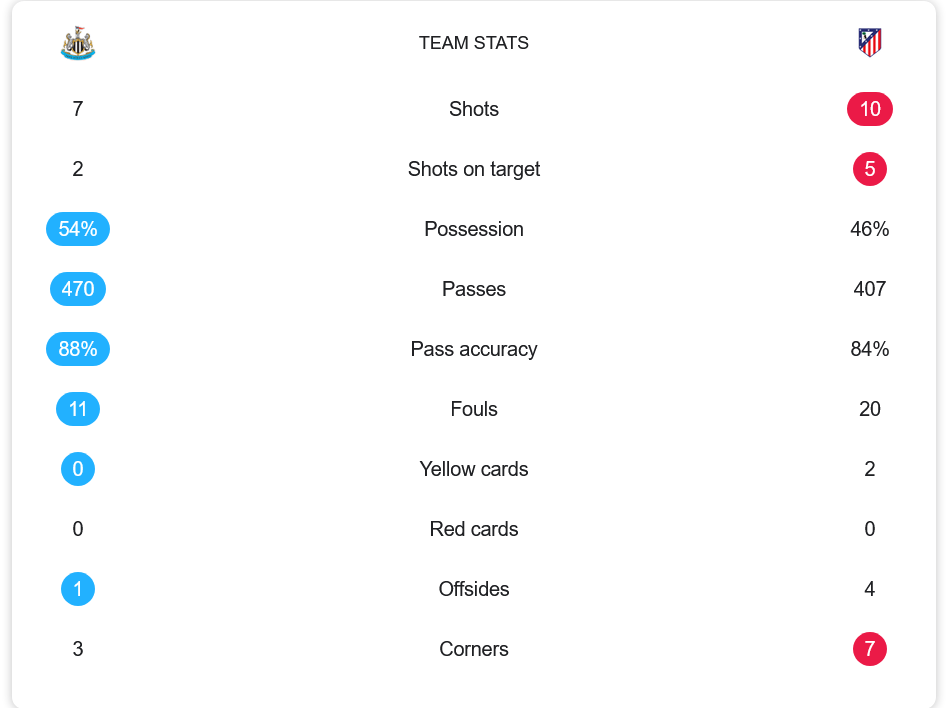 แม้นิวคาสเซิ่ลจะครองบอลมากกว่า 54% และผ่านบอลแม่นถึง 88% จาก 470 ครั้ง แต่โอกาสยิงเข้ากรอบมีเพียง 2 ครั้ง ขณะที่ แอต.มาดริด แม้ครองบอลเพียง 46% แต่สร้างโอกาสยิงเข้ากรอบถึง 5 จาก 10 ครั้ง และเปลี่ยนเป็น 2 ประตู เกมนี้เต็มไปด้วยการปะทะ ฟาวล์รวมถึง 31 ครั้ง ใบเหลืองฝั่งทีมเยือน 2 ใบจากการเข้าสกัดหนักหน่วง
