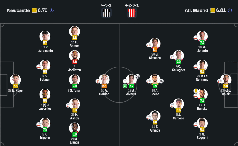 เกมนี้ นิวคาสเซิ่ล เลือกใช้ระบบ 4-5-1 เพื่อครองบอลและแพ็กกลางแน่น มี โตนาลี เป็นตัวเชื่อม เกมรุกพยายามโจมตีริมเส้นผ่าน ทริปเปียร์ และ อีลังกา แต่การเข้าทำยังขาดความหลากหลาย ในทางกลับกัน แอต.มาดริด เล่น 4-2-3-1 เน้นวางโครงเกมรับเหนียวแน่นและสวนกลับเร็ว เมื่อมีโอกาสขึ้นเกมจะใช้การประสานงานระหว่าง อัลบาเรซ กับ บาเอน่า ที่เล่นกันได้ลงตัว ความเด็ดขาดในพื้นที่สุดท้ายคือจุดชี้ขาดของเกมนี้ ซึ่งเป็นสิ่งที่ต่างออกไปชัดเจนในเชิง วิเคราะห์บอล