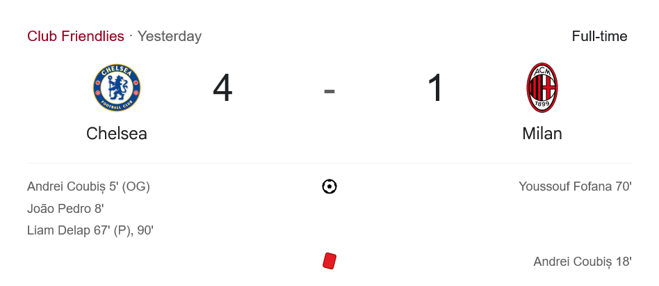 แม้เป็นเกมอุ่นเครื่อง แต่ชัยชนะเหนือมิลาน 4-1 ถือเป็นการส่งสัญญาณชัดเจนว่าเชลซีพร้อมเต็มร้อยก่อนเปิดฤดูกาลพรีเมียร์ลีก ขณะที่มิลานต้องแก้เกมรับและการรับมือสถานการณ์เหลือผู้เล่นน้อยกว่า