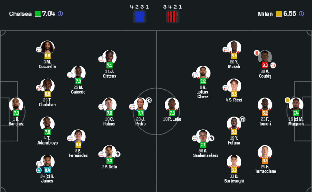 เชลซีภายใต้แผน 4-2-3-1 ของเอนโซ่ มาเรสก้า เน้นการครองบอล (54%) และการต่อบอลที่แม่นยำสูงถึง 92% ทำให้เกมรุกไหลลื่นทั้งจากด้านข้างและตรงกลาง โดยมีจุดเด่นในการใช้ฟูลแบ็กดันสูงสร้างความกดดันต่อแนวรับคู่แข่ง ส่วนมิลานของมัสซิมิเลียโน อัลเลกรีใช้ระบบ 3-4-1-2 ซึ่งต้องปรับแท็กติกอย่างรวดเร็วหลังเหลือ 10 คนตั้งแต่ต้นเกม ส่งผลให้เกมรับต้องถอยลึกและเสียพื้นที่แดนกลาง การขึ้นเกมรุกต้องพึ่งบอลยาวและการลากเลื้อยของเลโอเป็นหลัก แต่ไม่สามารถเจาะแนวรับเจ้าบ้านได้มากนัก