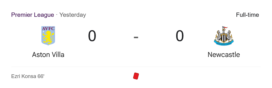 วิลล่าต้องพบกับปัญหาใหญ่เมื่อ เอซรี่ คอนซ่า ไปตัดฟาวล์แบบมืออาชีพในจังหวะหลุดเดี่ยวของแนวรุกนิวคาสเซิ่ล ทำให้โดนใบแดงไล่ออกโดยตรงในนาทีที่ 66 ส่งผลให้เจ้าถิ่นต้องปรับแท็กติกเน้นตั้งรับลึกทันที ด้านทีมเยือนโหมบุกเต็มกำลังแต่จังหวะสุดท้ายยังขาดความเฉียบคม โดยเฉพาะโอกาสทองของ อ็องโตนี่ กอร์ดอน และ บรูโน่ กิมาไรส์ ที่ยิงหลุดกรอบไปแบบได้ลุ้น