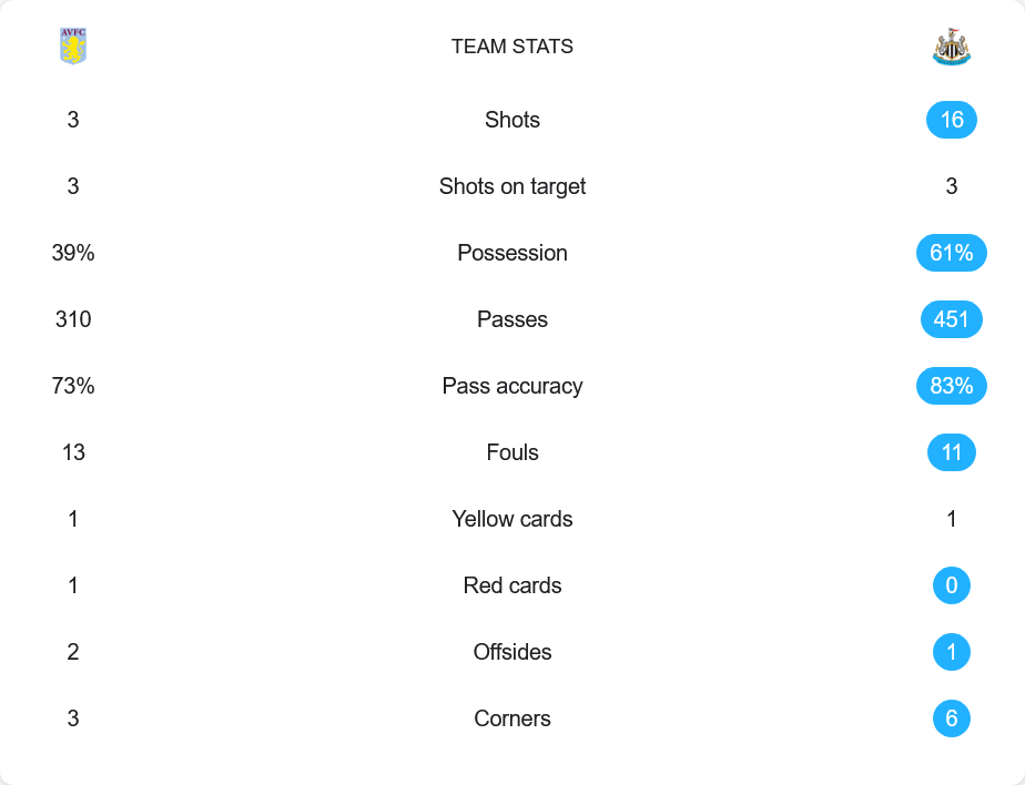 แม้ผล บ้านผลบอล จะจบลงด้วยสกอร์ 0-0 แต่ตัวเลขสถิติชี้ชัดว่าทีมเยือนครองเกมเหนือกว่าอย่างชัดเจน โดย นิวคาสเซิ่ล มีโอกาสยิงถึง 16 ครั้ง เทียบกับเพียง 3 ของเจ้าบ้าน ครองบอลถึง 61% ด้วยจำนวนการผ่านบอลมากกว่า 451 ครั้งและความแม่นยำถึง 83% ขณะที่วิลล่าเน้นตั้งรับ มีเปอร์เซ็นต์ครองบอลเพียง 39% และผ่านบอล 310 ครั้ง ความแม่นยำเพียง 73% โอกาสเตะมุมของนิวคาสเซิ่ลก็เหนือกว่าที่ 6 ครั้งเทียบกับ 3 ของเจ้าถิ่น