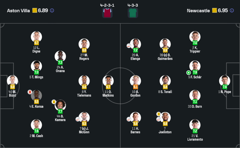 ในมุมมอง วิเคราะห์บอล แอสตัน วิลล่า พยายามใช้ระบบ 4-2-3-1 เน้นความสมดุลในแดนกลางโดยมี กามาร่า และ โอนาน่า คอยคุมเกม ซึ่งทำได้ดีในครึ่งแรก แต่การถูกใบแดงของคอนซ่าเปลี่ยนรูปเกมทันที ทำให้ต้องหันมาใช้แผนรับลึกเน้นโต้กลับ ขณะที่การสร้างสรรค์เกมรุกจาก โรเจอร์ส และ ตีเลอมองส์ ยังไม่สามารถทะลวงแนวรับนิวคาสเซิ่ลได้เลย