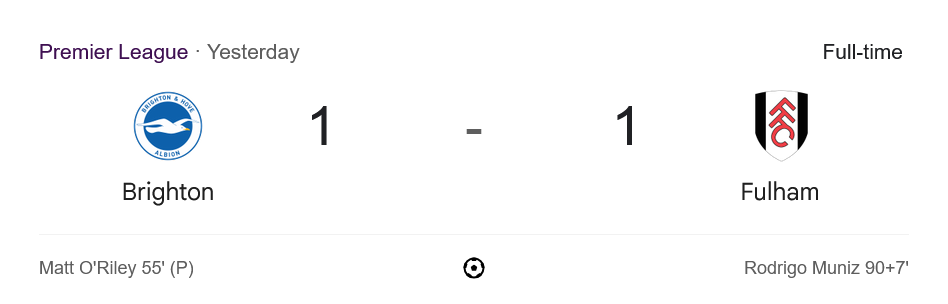 เริ่มได้ 10 นาที ไบรท์ตันมาได้จุดโทษและเป็น แม็ตต์ โอ’ไรลีย์ ที่รับหน้าที่สังหารเข้าไปไม่พลาดในนาที 55 ส่งให้เจ้าถิ่นขึ้นนำ 1-0 ท่ามกลางเสียงเชียร์ลั่นสนาม ดิ อเมริกัน เอ็กซ์เพรสส์ สเตเดี้ยม เกมดูเหมือนจะจบลงด้วยชัยชนะของเจ้าถิ่น แต่แล้วความดราม่าก็เกิดขึ้นในช่วงทดเวลาบาดเจ็บนาทีที่ 90+7 เมื่อ โรดรีโก้ มูนิซ ตัวสำรองของฟูแล่มซัดตีเสมอแบบช็อกแฟนเจ้าถิ่น ทำให้จบเกมแบ่งแต้มกันไปสุดเดือด