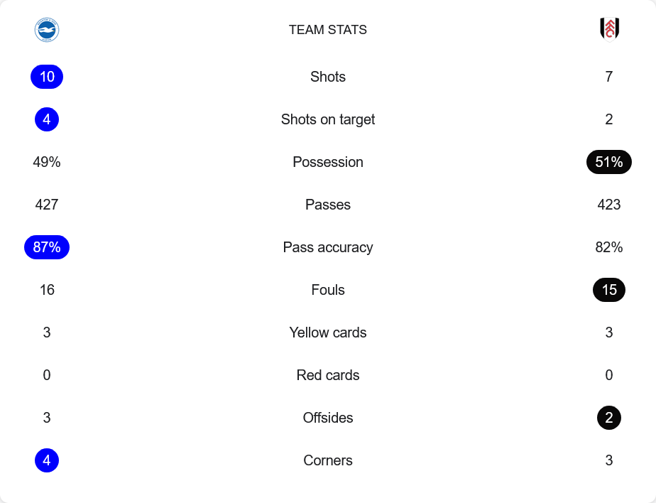 แม้ ผลบอลสด จะระบุว่าเกมจบ 1-1 แต่ไบรท์ตันมีโอกาสยิงมากกว่า โดยยิงไปถึง 10 ครั้ง เข้ากรอบ 4 ส่วนฟูแล่มยิงแค่ 7 ครั้ง เข้ากรอบเพียง 2 ทั้งสองทีมครองบอลสูสี ฟูแล่มเฉือนเล็กน้อยที่ 51% ต่อ 49% การจ่ายบอลใกล้เคียงกัน (ไบรท์ตัน 427 ครั้ง / ฟูแล่ม 423 ครั้ง) ความแม่นยำไบรท์ตันทำได้ดีกว่าที่ 87% ต่อ 82% ฟาวล์รวมกันถึง 31 ครั้ง และใบเหลืองฝั่งละ 3 ใบ บ่งบอกถึงความดุดันของเกมที่ไม่มีใครยอมใคร