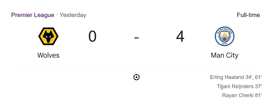 วูล์ฟส์พยายามฮึดแต่แทบไม่มีจังหวะจบสกอร์ถนัดถนี่ ก่อนที่ แมนฯ ซิตี้ จะมาเร่งเครื่องใส่อีกครั้งในช่วงท้ายเกม นาที 61 ฮาแลนด์ กดประตูที่สองของตัวเองจากลูกแอสซิสต์ของ ไรจ์นเดอร์ส ก่อนจะตอกฝาโลงในนาที 81 เมื่อ ไรอัน แชร์กี้ ตัวสำรองหลุดเข้าไปยิงแบบเฉียบขาด จบเกม แมนฯ ซิตี้ บุกถล่ม วูล์ฟแฮมป์ตัน 4-0 ชนิดที่เกมรับเจ้าถิ่นพังยับเยิน