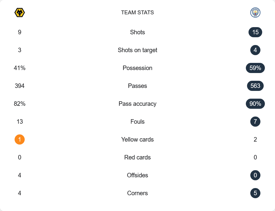 แมนเชสเตอร์ ซิตี้ ครองบอลเหนือกว่าด้วยเปอร์เซ็นต์ 59% เทียบกับวูล์ฟส์ที่มีเพียง 41% ซิตี้ผ่านบอลไปถึง 563 ครั้ง และจ่ายแม่นถึง 90% ในขณะที่วูล์ฟส์ทำได้ 394 ครั้ง และความแม่นยำอยู่ที่ 82% ทั้งสองทีมมีโอกาสยิงทั้งหมด 15 และ 9 ครั้งตามลำดับ โดยซิตี้ยิงตรงกรอบ 4 ครั้งได้ 4 ประตูเต็มๆ เกมนี้ยังมีฟาวล์เกิดขึ้นรวม 20 ครั้ง และไม่มีใบแดงแม้แต่ใบเดียว