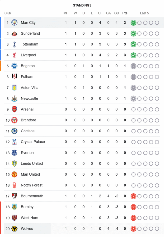 จากชัยชนะถล่มทลาย 4-0 ทำให้ แมนเชสเตอร์ ซิตี้ ขึ้นนำเป็นจ่าฝูงพรีเมียร์ลีกแบบหล่อๆ ด้วยผลต่างประตูได้เสียที่ +4 เท่ากับแต้มของ ซันเดอร์แลนด์ และ สเปอร์ส ที่ชนะในเกมแรกเหมือนกัน แต่ประตูได้ซิตี้มากสุด ขณะที่วูล์ฟส์ จมบ๊วยอันดับ 20 หลังโดนยิงเละและไม่มีแต้มติดมือ