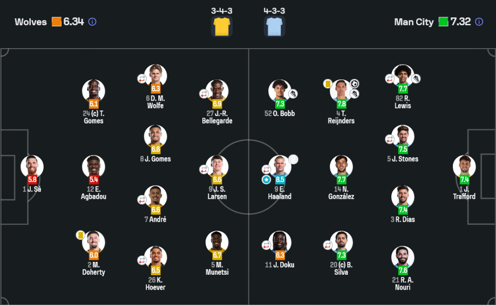 ฝั่งวูล์ฟส์ แม้จะจัดทีมเน้นรับเป็นหลักด้วย 3-4-3 แต่การยืนตำแหน่งในแนวรับขาดความกระชับ โดนเจาะด้านข้างตลอดเกม แดนกลางแม้จะมีจังหวะตัดเกมได้บ้างแต่ไม่สามารถสร้างเกมรุกที่มีคุณภาพได้เลย ซึ่งหากวิเคราะห์บอลในภาพรวมแล้ว ซิตี้ดูครบเครื่องทั้งระบบรับและรุก ขณะที่วูล์ฟส์ยังขาดความแม่นยำและวินัยเกมรับอย่างชัดเจน