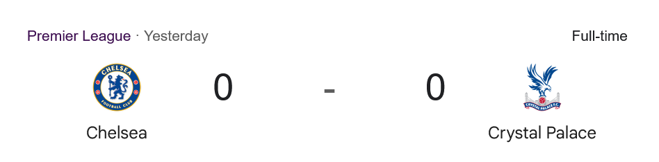 สิงห์บลูส์ยังคงไล่บดด้วยพลังหนุ่มแบบ non-stop มีการเติมเต็มด้วยตัวสำรองอย่าง เอสเตวาโอ, อังเดร ซานโต๊ส และ มาลู กุสโต้ ที่ช่วยเพิ่มสปีดและความหลากหลาย แต่แนวรับของพาเลซที่นำโดย ลาครัวซ์, กูเอฮี และริชาร์ดส์ ไม่ปล่อยให้จบสกอร์ง่ายๆ พร้อมกับมือกาว ดีน เฮนเดอร์สัน ที่โชว์ความเหนียวอย่างสุดยอด สุดท้ายเสียงนกหวีดหมดเวลาดังขึ้นด้วยสกอร์ 0-0 บ้านผลบอลสรุปว่าเชลซีแม้จะยิงมากกว่า แต่ก็เจาะไม่เข้า สุดท้ายต้องแชร์แต้มกับทีมเยือนอย่างมีรสชาติ