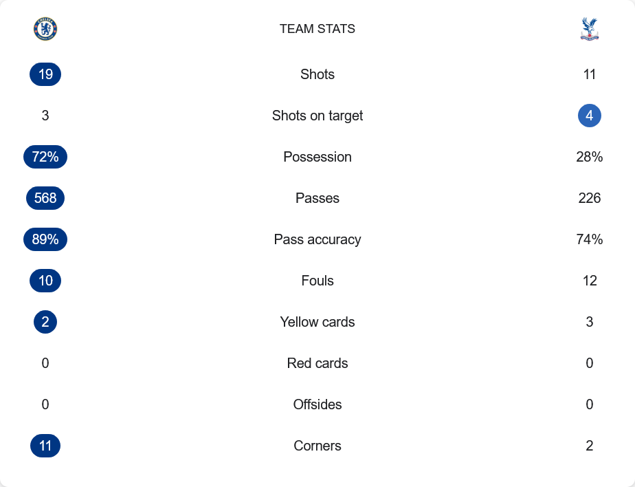 เชลซีครองบอลมากถึง 72% และผ่านบอลกว่า 568 ครั้ง ด้วยความแม่นยำสูงถึง 89% ขณะที่พาเลซมีโอกาสเพียง 11 ครั้งแต่เป้าหมายตรงกรอบ 4 ครั้ง เรียกได้ว่าเน้นประสิทธิภาพมากกว่าปริมาณ ลูกเตะมุม 11 ครั้งของเจ้าบ้านชี้ให้เห็นถึงความกดดันต่อแนวรับคู่แข่งอย่างต่อเนื่อง แต่สุดท้ายไม่สามารถแปรเปลี่ยนเป็นประตูได้ ความแตกต่างในการจบสกอร์คือสิ่งที่ต้องปรับปรุงหากสิงห์บลูส์หวังลุ้นพื้นที่ยุโรป