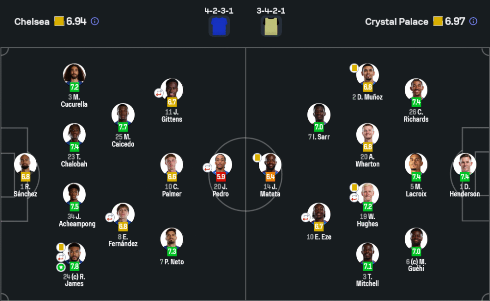 - กองกลางตัวรุก: จามาล กิทเทนส์ (6.7), โคล พาลเมอร์ (6.6), เปโดร เนโต้ (7.3)