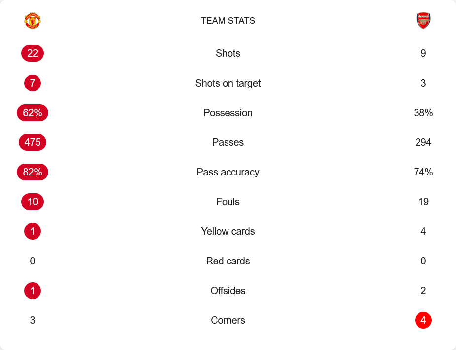 แม้ปีศาจแดงจะครองบอลมากถึง 62% และมีโอกาสยิงถึง 22 ครั้ง แต่จบไม่คม มีเพียง 7 ลูกที่เข้ากรอบ ต่างจากอาร์เซนอลที่ยิงเพียง 9 ครั้ง แต่เปลี่ยนเป็นประตูได้ 1 ลูกอย่างเฉียบคม โดยมีเปอร์เซ็นต์การผ่านบอลแม่นยำ 74% เทียบกับเจ้าบ้านที่แม่นยำกว่าเล็กน้อยที่ 82% แต่โดนสวนกลับเสียประตู ความดุดันของปืนใหญ่ชัดเจนในการใช้โอกาสน้อยแต่เฉียบขาด