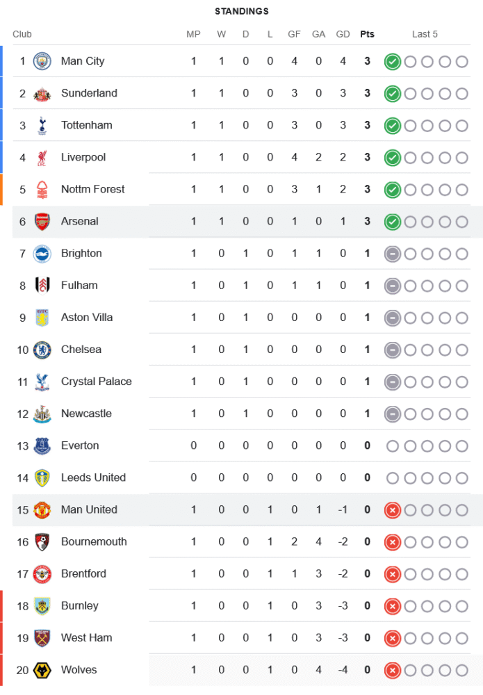 อาร์เซนอลคว้า 3 แต้มเต็มจากเกมเยือนสุดหิน ขยับขึ้นอันดับ 6 ของตาราง ตามหลังจ่าฝูงอย่างแมนซิตี้เพียงประตูได้เสีย ส่วนแมนฯ ยูไนเต็ดหล่นไปอยู่ที่ 15 แบบน่าเจ็บใจ เพราะเปิดซีซั่นมาด้วยความพ่ายแพ้ในบ้านทันที เสียงวิจารณ์ต่อทีมและผู้จัดการเริ่มดังขึ้นอีกครั้ง