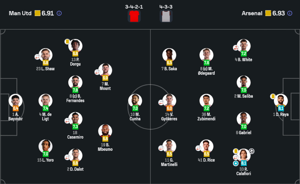 แมนฯ ยูไนเต็ดมาในระบบ 3-4-2-1 เน้นครองบอล เปิดเกมรุกทางริมเส้นเป็นหลัก แต่ขาดความเฉียบคมในพื้นที่สุดท้าย แม้จะมีผู้เล่นเทคนิคดีอย่างบรูโน่และเมาท์ แต่ยังเจาะแนวรับอาร์เซนอลไม่เข้า