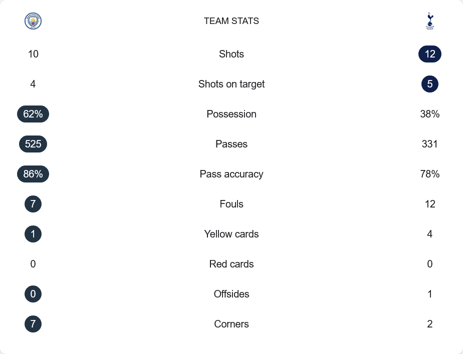 แม้ซิตี้ครองบอล 62% ยิงรวม 10 ครั้ง เข้ากรอบ 4 ครั้ง แต่ไม่คมพอ สเปอร์สครองบอลเพียง 38% ยิง 12 ครั้ง เข้ากรอบ 5 ครั้ง และเปลี่ยนเป็น 2 ประตู เกมฟาวล์ค่อนข้างหนัก ซิตี้ทำ 7 ครั้ง สเปอร์ส 12 ครั้ง ได้ใบเหลืองถึง 4 ใบ ซิตี้ได้เตะมุม 7 ครั้ง ขณะที่ทีมเยือนได้เพียง 2 ครั้ง แต่เกมรับแน่นหนาทำให้ไม่เสียประตู