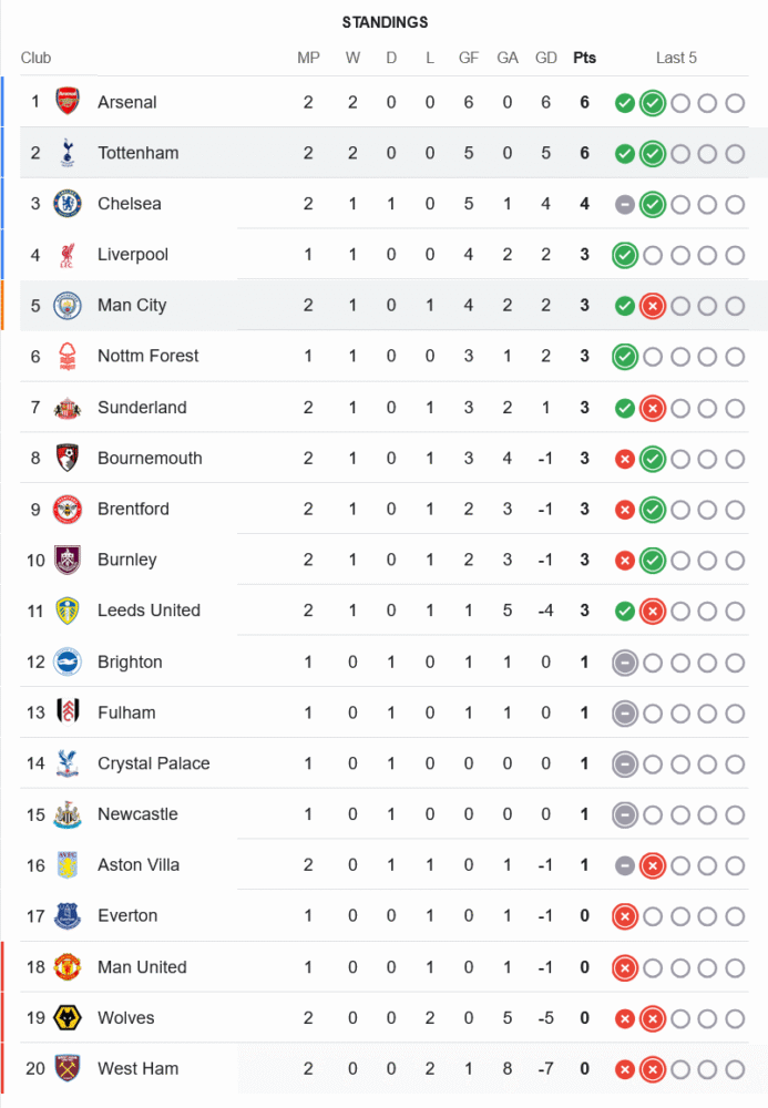 ชัยชนะนัดนี้ส่งสเปอร์สเก็บ 6 แต้มเต็มจาก 2 นัด รั้งอันดับ 2 ร่วมกับอาร์เซน่อลแบบไร้พ่าย ขณะที่ซิตี้แพ้เป็นนัดแรก มีเพียง 3 คะแนนจาก 2 เกม หล่นไปอยู่อันดับ 5 ของตาราง ต้องเร่งคืนฟอร์มด่วน