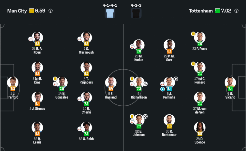 เจา ปาลินญ่า คือยอดแข้งในค่ำคืนนี้ ยิง 1 ประตู และตัดเกมกลางสนามจนฮาลันด์แทบหายไปจากเกม มีบทบาทสำคัญทั้งเกมรับและรุก ได้เรตติ้งสูงสุด 8.4 และยืนยันสถานะมิดฟิลด์เบอร์หนึ่งของสเปอร์ส