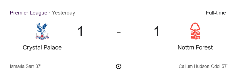 เริ่มมาเพียง 12 นาที ฟอเรสต์หาจังหวะสำเร็จ นาที 57 คัลลัม ฮัดสัน-โอดอย โชว์ความเฉียบคมซัดตีเสมอ 1-1 หลังจากนั้นเกมเปิดมากขึ้น ทั้งสองทีมมีการเปลี่ยนตัวหลายตำแหน่ง โดยฟอเรสต์ส่ง คาลิมูเอนโด้ และเจมส์ แม็คเอที ลงมาเพิ่มมิติ ขณะที่พาเลซใช้ เลร์มา และเอ็นคีเตียเติมพลังแดนกลาง เกมดุดันขึ้นเรื่อย ๆ มีใบเหลืองกระจายทั้งสองฝั่งแต่ไม่มีใครเจาะตาข่ายเพิ่ม จบเกมเสมอกันไปแบบสุดมันส์