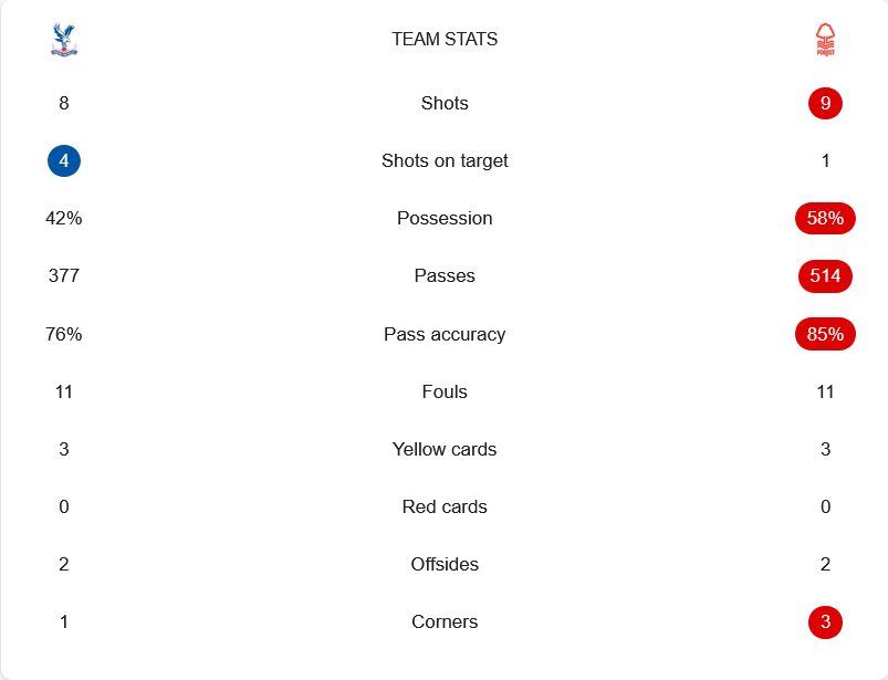 ตัวเลขหลังเกมยืนยันว่าฟอเรสต์ครองบอลเหนือกว่าที่ 58% ต่อ 42% ของพาเลซ แต่เจ้าถิ่นสร้างโอกาสยิงเข้ากรอบได้ 4 ครั้ง จากทั้งหมด 8 ครั้ง มากกว่าทีมเยือนที่เข้ากรอบเพียง 1 จาก 9 ครั้ง การจ่ายบอล ฟอเรสต์ทำได้ 514 ครั้ง ความแม่นยำ 85% ขณะที่พาเลซจ่าย 377 ครั้ง ความแม่นยำ 76% เกมนี้มีใบเหลืองรวม 6 ใบ แบ่งกันทีมละ 3 ฟาวล์รวม 22 ครั้ง แสดงให้เห็นถึงความเข้มข้นตลอดทั้ง 90 นาที