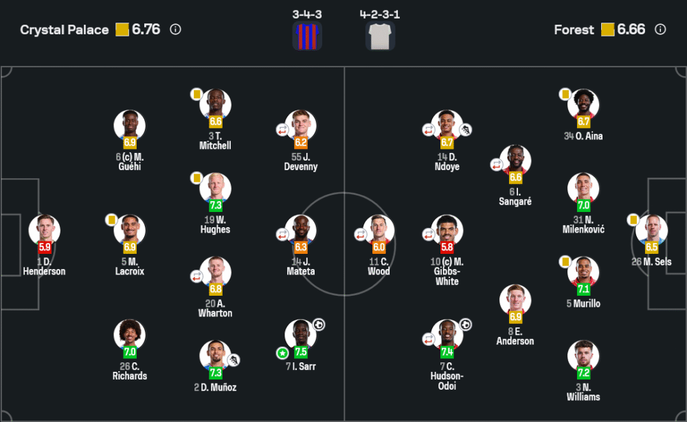 เกมนี้ต้องยกให้ อิสไมล่า ซาร์ร ปีกจรวดของพาเลซ ยิงประตูเบิกร่อง สร้างปัญหาให้แนวรับฟอเรสต์ทั้งเกม คะแนนสูงสุด 7.5 พร้อมพลังสปีดและการเลี้ยงกินตัวที่ทำให้เจ้าบ้านมีทีเด็ดในเกมสวนกลับ