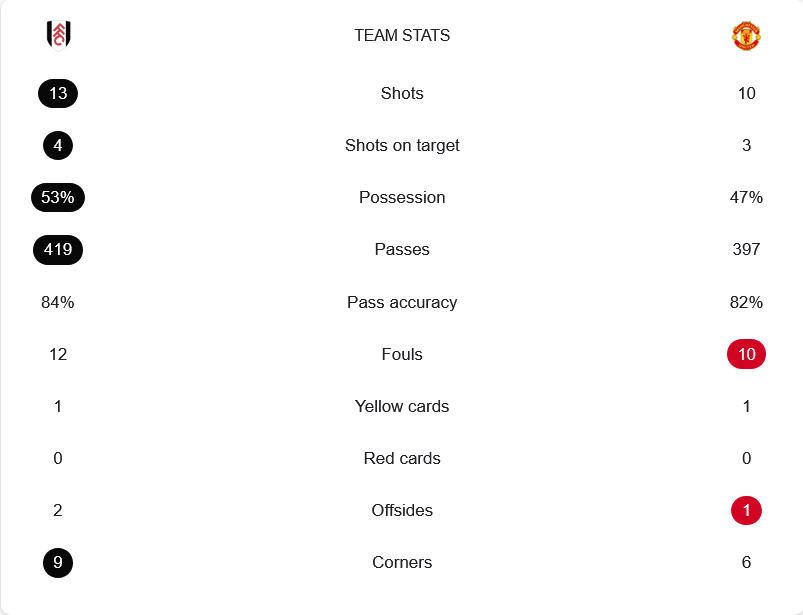 ฟูแล่มมีโอกาสยิงมากกว่า 13 ครั้ง เข้ากรอบ 4 ส่วนแมนยูยิง 10 ครั้ง เข้ากรอบ 3 ครองบอลฟูแล่ม 53% แมนยู 47% การผ่านบอลเจ้าบ้านแม่นยำ 84% ส่วนทีมเยือน 82% ฟาล์วรวม 22 ครั้ง มีใบเหลืองทีมละหนึ่งใบ มุมฟูแล่มได้มากถึง 9 ครั้ง ขณะที่แมนยูมีเพียง 6 ครั้ง แต่ก็ยังไม่สามารถปิดเกมได้