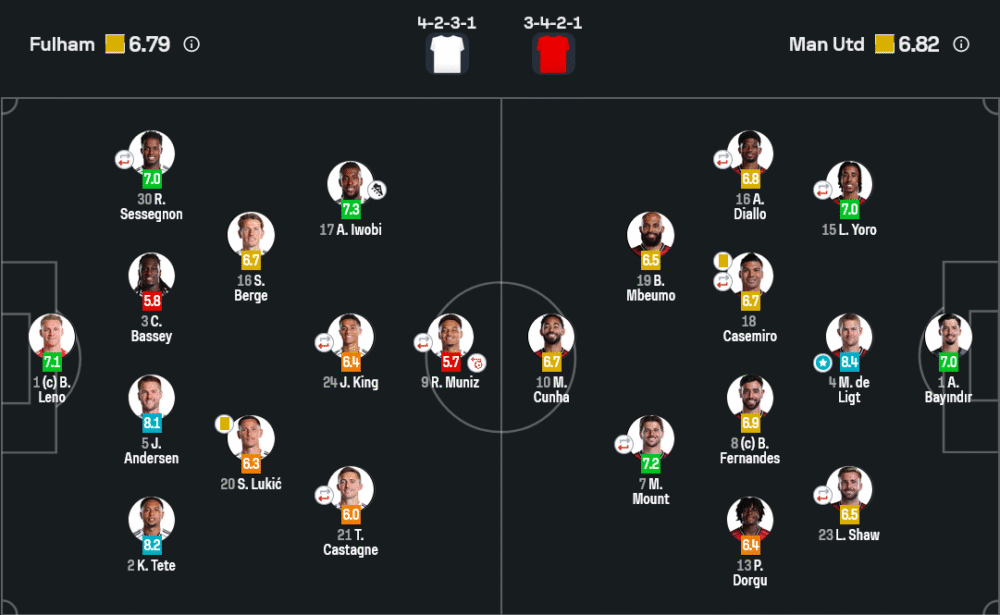 เกมนี้ต้องยกให้ มัทไธจ์ส เดอ ลิกต์ กองหลังตัวแกร่งของแมนยูที่ทำผลงานโดดเด่นทั้งการอ่านเกม การตัดบอล และการประกบกองหน้าฟูแล่มได้อยู่หมัด ได้คะแนนสูงสุด 8.4 สมกับเป็นผู้นำในแนวรับ