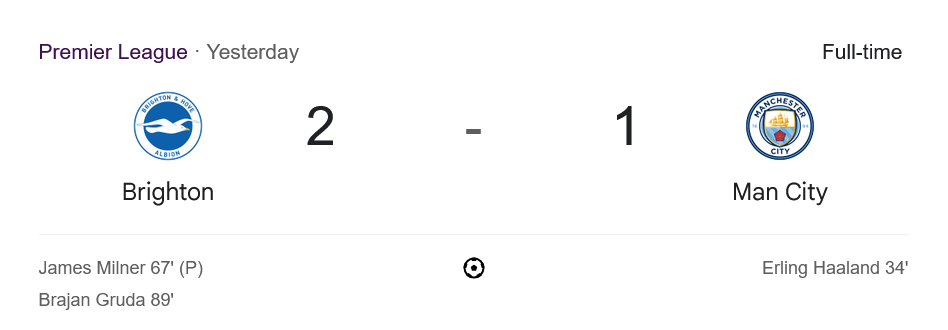 บ้านกีฬา ขอสรุป ผลบอลสด สุดมันส์จากศึกพรีเมียร์ลีก อังกฤษ ที่สนามเอเม็กซ์ สเตเดี้ยม เมื่อคืนที่ผ่านมา “นกนางนวล” ไบรท์ตัน โฮฟ อัลเบี้ยน ระเบิดฟอร์มโหดไล่แซงดับ “เรือใบสีฟ้า” แมนเชสเตอร์ ซิตี้ 2-1 จากสองประตูของ เจมส์ มิลเนอร์ (จุดโทษนาที 67) และ เบรยาน กรูด้า (นาที 89) หลังโดน เออร์ลิง ฮาแลนด์ ยิงนำตั้งแต่นาที 34 เกมนี้พลิกสถานการณ์สุดดราม่า ทำเอาแชมป์เก่าต้องช็อกคาสนาม