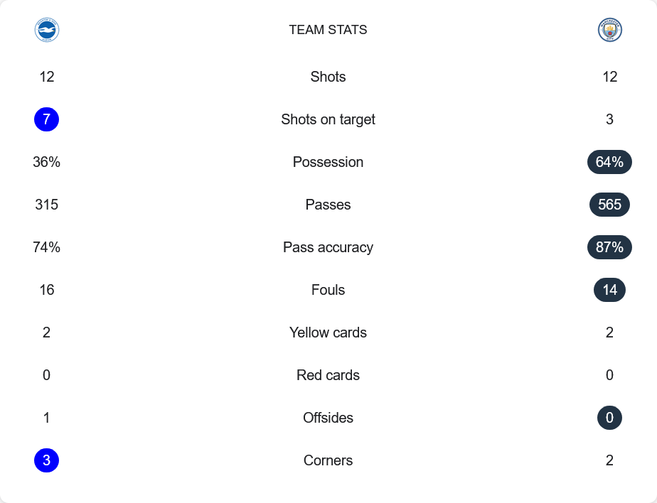 ซิตี้ครองบอลมากถึง 64% ต่อ 36% ของไบรท์ตัน จ่ายบอลรวม 565 ครั้งแม่นยำถึง 87% ส่วนเจ้าบ้านผ่านบอล 315 ครั้งแม่นยำ 74% ทั้งคู่ยิงเท่ากัน 12 ครั้ง แต่ไบรท์ตันเข้ากรอบถึง 7 ครั้ง ต่างจากซิตี้ที่ทำได้เพียง 3 ครั้ง ฟาวล์ใกล้เคียงกัน 16 ต่อ 14 มีใบเหลืองฝั่งละ 2 ใบ เกมนี้ลูกเตะมุมก็สูสี ไบรท์ตันได้ 3 ซิตี้ได้ 2