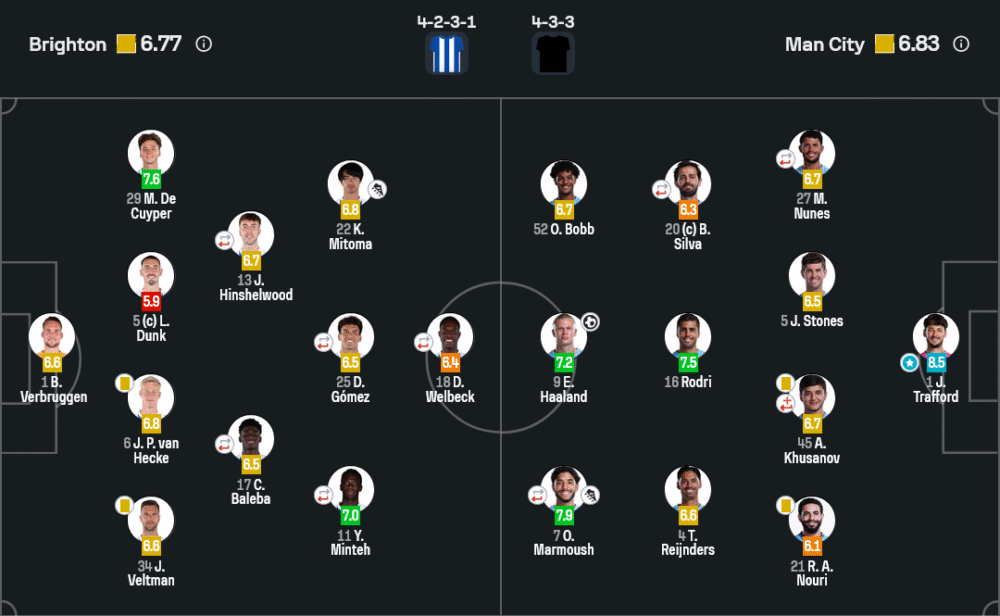 แมนซิตี้วาง 4-3-3 ครองบอล 64% ต่อ 36% ของเจ้าบ้าน คุมเกมแดนกลางด้วยโรดรี้และแบร์นาร์โด้ แต่ปัญหาคือการเข้าทำมีเพียงไม่กี่จังหวะที่ชัดเจน เกมรับมีช่องโหว่ทางริมเส้นให้ไบรท์ตันเจาะได้หลายครั้ง เชิง วิเคราะห์บอล เกมนี้เห็นชัดว่าแม้ซิตี้จะเหนือกว่าเชิงสถิติ แต่ไบรท์ตันมีความมุ่งมั่นและความเฉียบคมช่วงท้ายเกมที่เด็ดขาดกว่า
