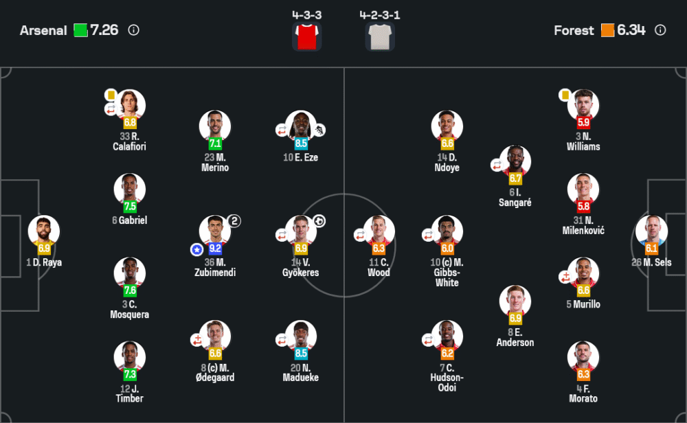 เกมนี้อาร์เซนอลใช้ระบบ 4-3-3 บีบพื้นที่และบุกจากแดนกลาง ซูบีเมนดี้ทำหน้าที่เชื่อมเกมได้อย่างยอดเยี่ยม พร้อมทะลุขึ้นไปทำประตูถึงสองครั้ง เกมรุกของปืนใหญ่มีทั้งความเร็วและการจบสกอร์ที่คมชัดจาก มาดูเอเก้ และ เอเซ่ ที่เล่นเด่นมาก ขณะที่เกมรับยังนิ่ง คุมพื้นที่ได้แม้ฟอเรสต์พยายามสวนกลับหลายครั้ง
